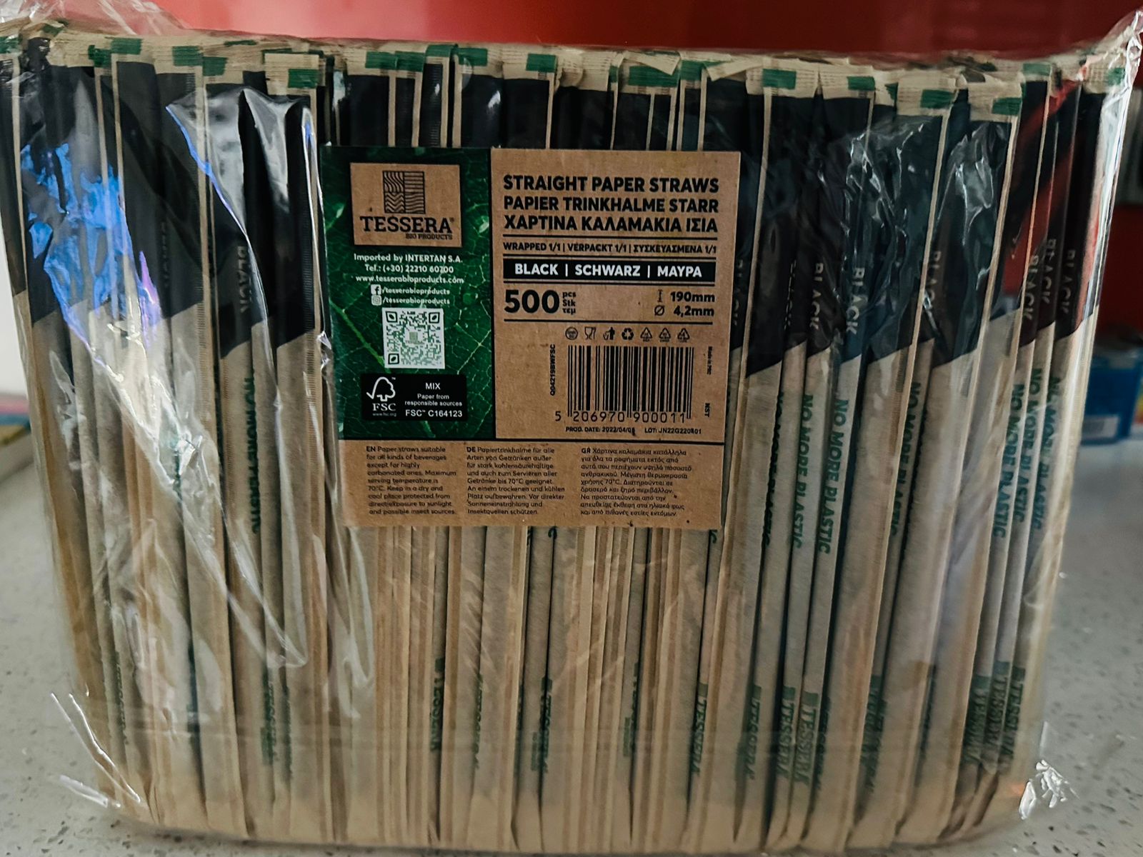 Individually wrapped eco-friendly, biodegradable drinking straws made from FSC-certified paper. Stylish black design, durable, and safe for both hot and cold beverages.